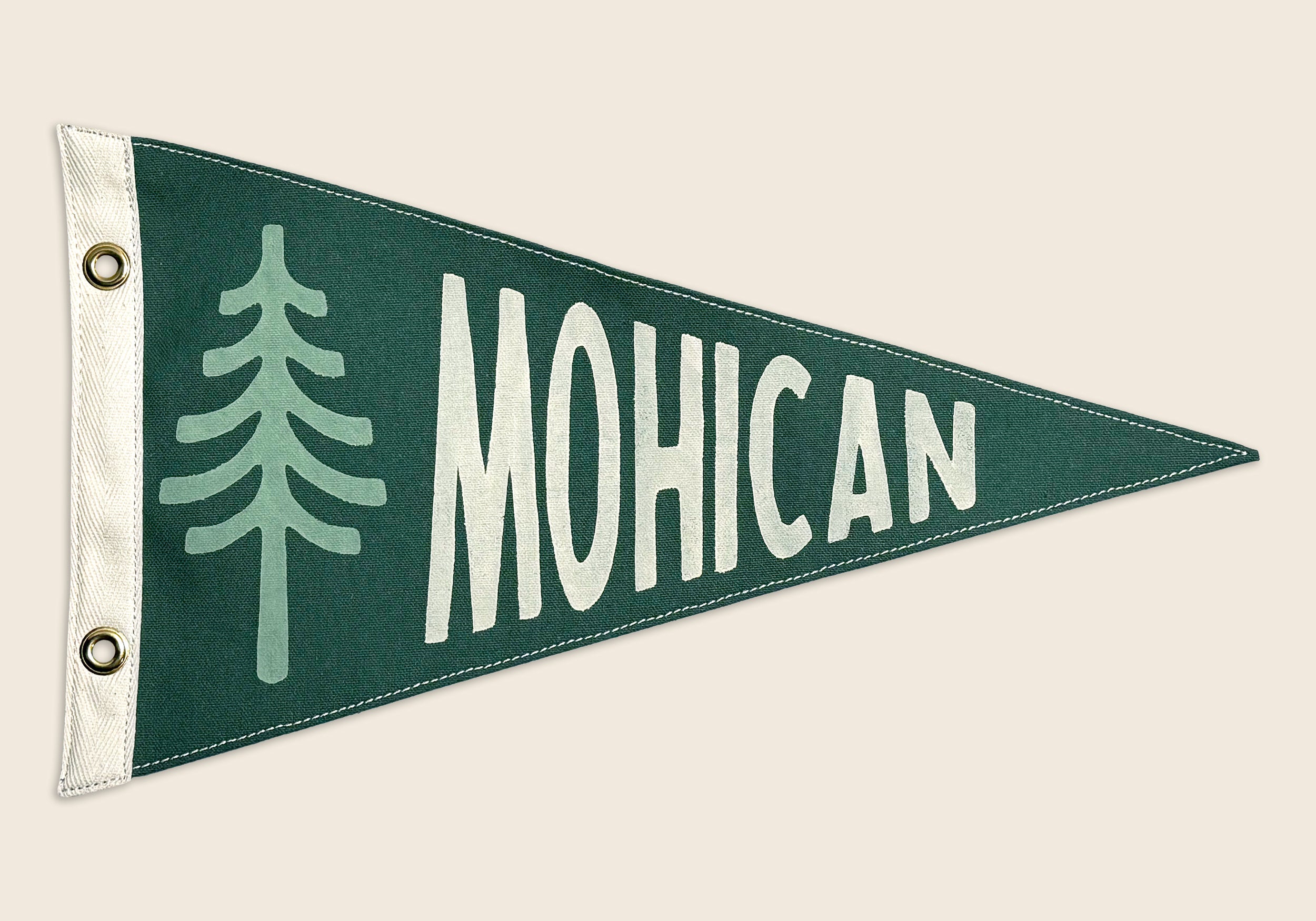 This hand-made Mohican pennant uses 9oz forest green duck canvas. Artwork is hand-painted with quality beige and fern green acrylic paint.
