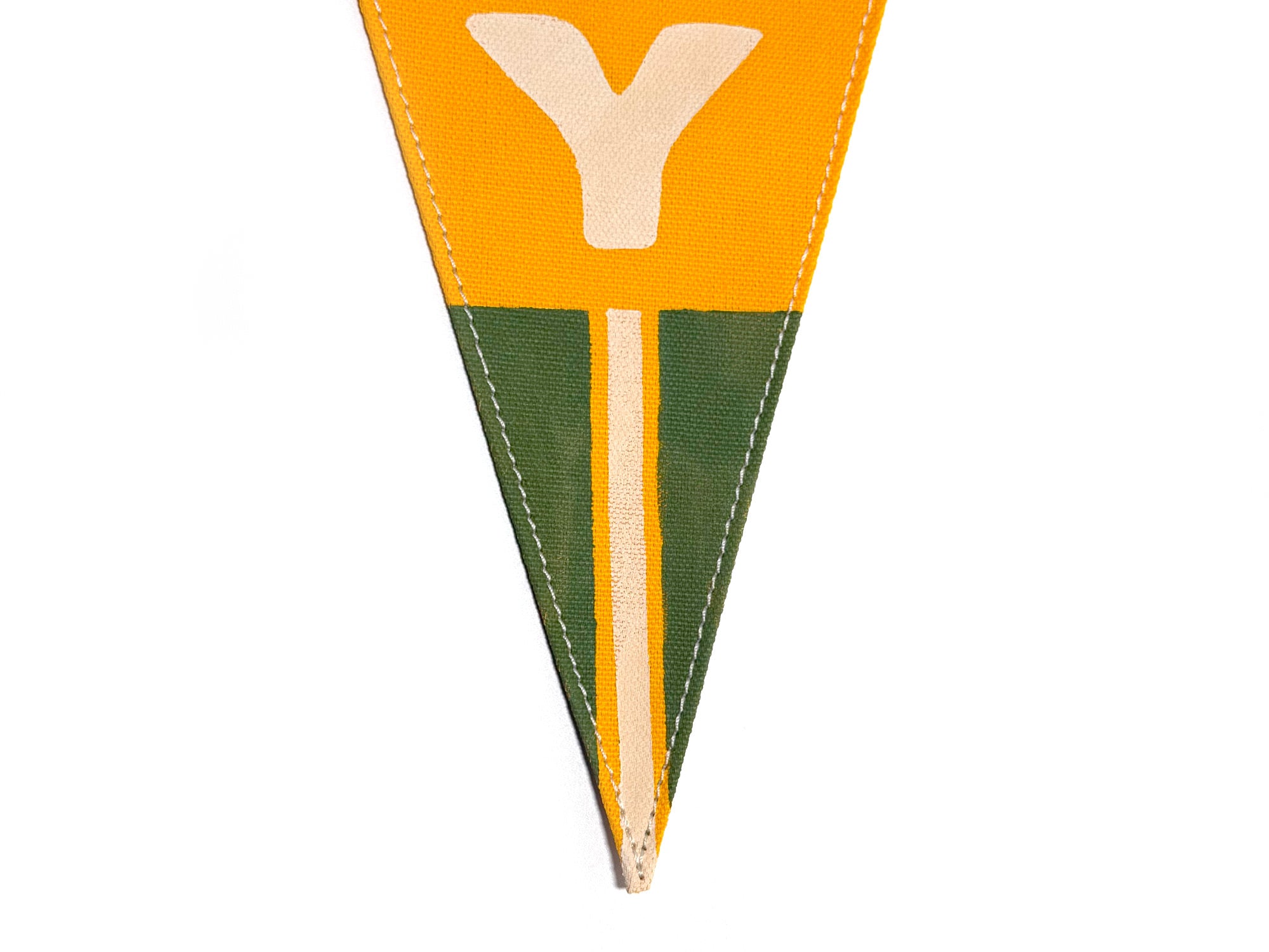 This hand-made Green Bay pennant uses 8oz yellow duck canvas. Artwork is hand-painted with quality beige and forest green acrylic paint.