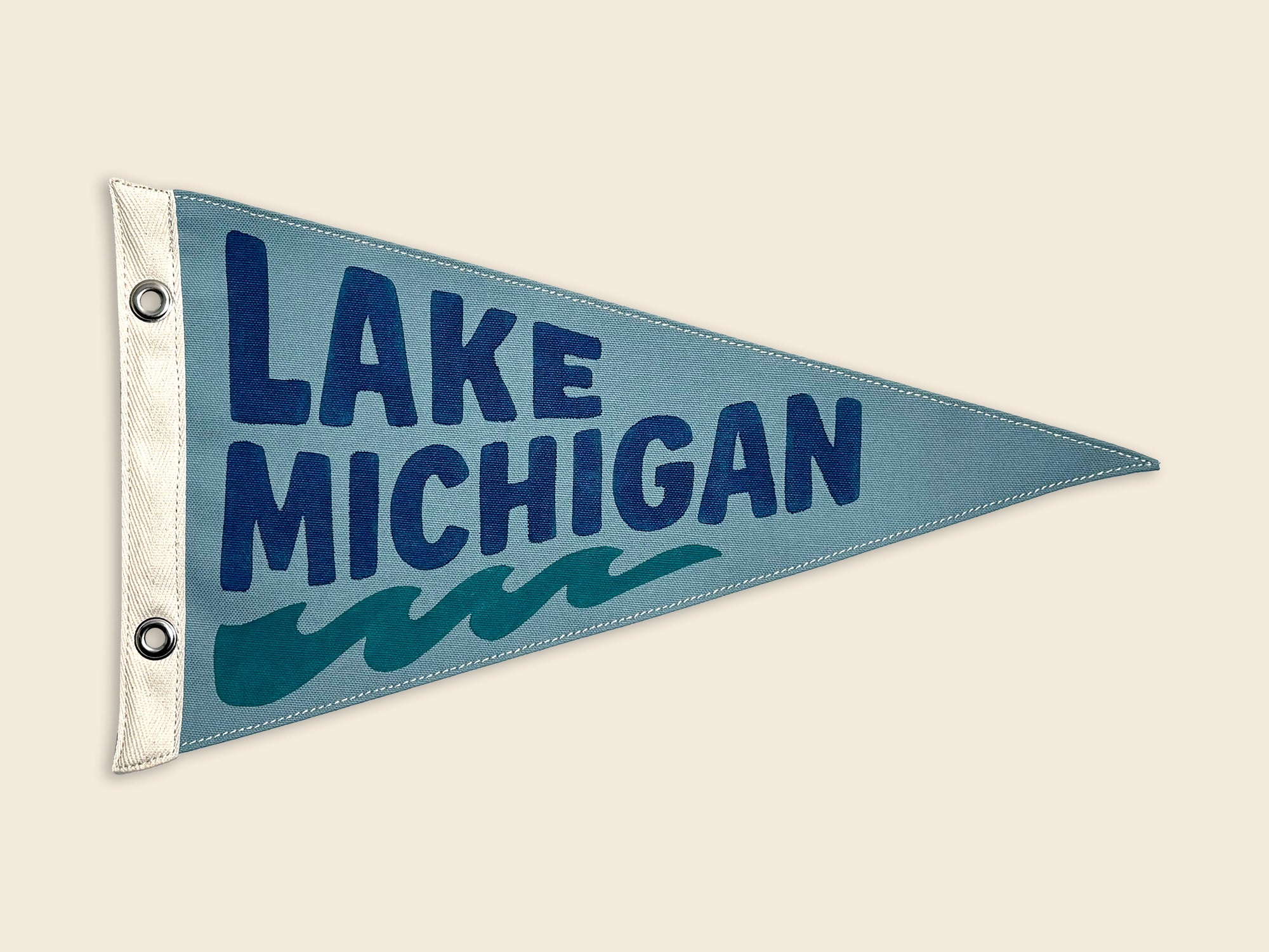 This hand-made Lake Michigan pennant uses 9oz sky blue duck canvas. Artwork is hand-painted with quality ocean blue and dark turquoise acrylic paint.