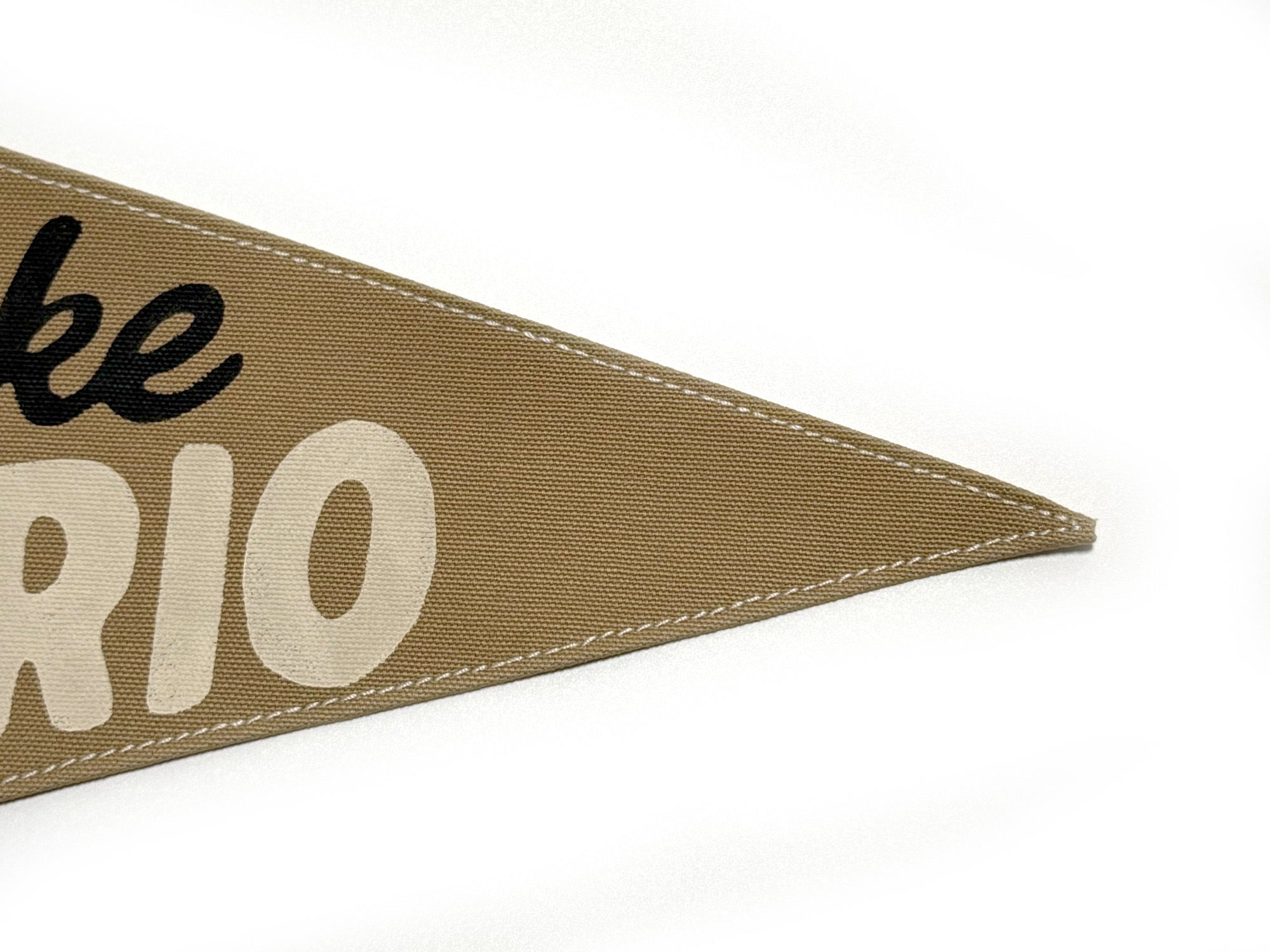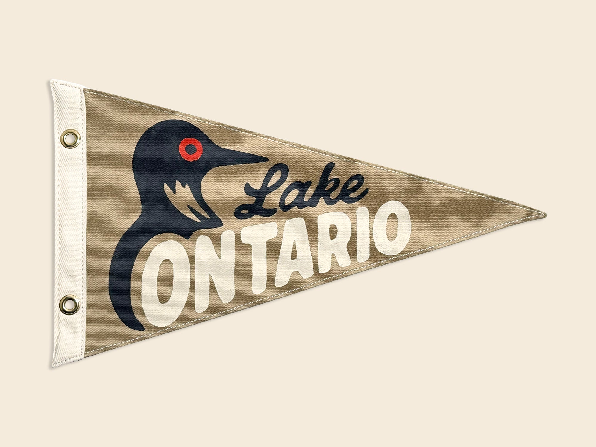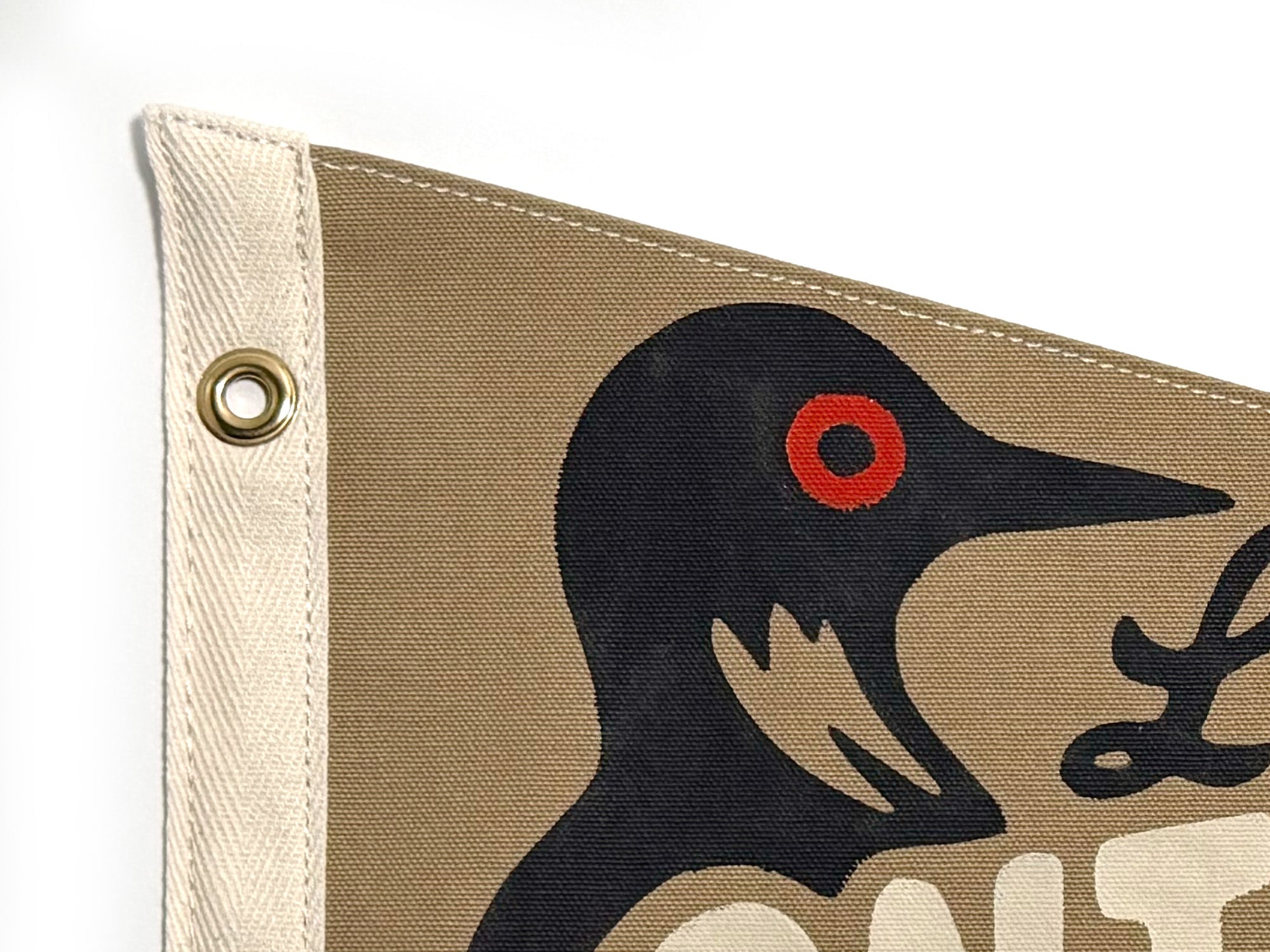 This hand-made Lake Ontario Loon pennant uses 9oz khaki duck canvas. Artwork is hand-painted with quality black, beige, and red acrylic paint.